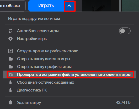 - В меню «Управление игрой» выберите пункт «Проверить и исправить файлы установленного клиента игры».
